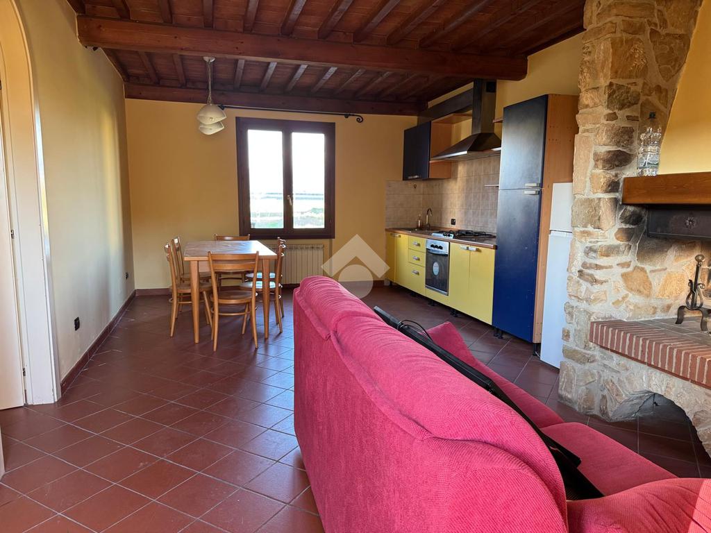 Tramite l’ingresso indipendente accediamo all’interno dell’appartamento, dove troviamo un open space di 30 mq con soggiorno e angolo cottura con travi e vista e camino in pietra.